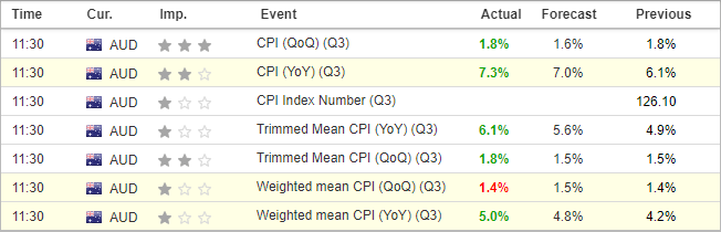 澳大利亚CPI同比增长7.3%,超过预测的7%,远高于第二季度的6.1%。澳联储即将采取哪些措施遏制通胀备受关注,CPI截尾均值同比上涨6.1%(预期为5.6%),加权平均同比增加5%(预期4.8%)。最新发布的月度通胀数据年率上升至7.3%,创下该系列数据2018年10月首发以来的新高。此外,核心CPI连续五个季度打破中期经济预测。总而言之,通胀火热。