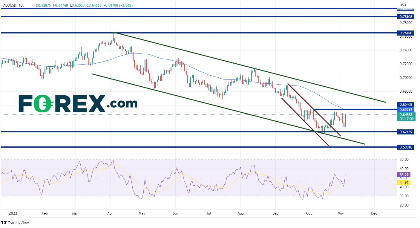 由于非农就业数据未产生实质性影响,再加上有消息称中国正在放松一些新冠管控,非美元货币都在上涨。在撰写本文时,澳元/美元当天上涨了近3%。该货币对自45日价格接近0.7650以来,一直在下行通道中走低。澳元/美元今天仍处于下行通道中。