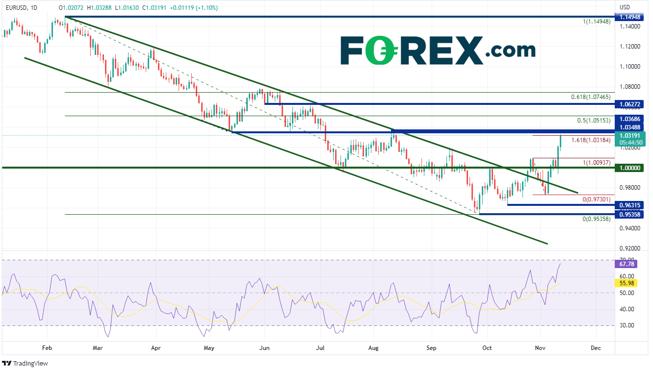 随着美国债券市场于周五收盘,同时密歇根消费者信心指数不包括新的通胀数据,因此美元在该指数发布后几乎没有变化。但美元的确在美国市场开盘后延续跌势,美元空头继续顺水推舟。从2月中旬到928日,欧元/美元在通道中稳步走低,该货币对一度跌至0.9536的低点。从那之后,该货币对持续走高,突破通道的上沿并继续攀升至1027日高点到113日低点区间的161.8%斐波那契扩展位1.0318附近。