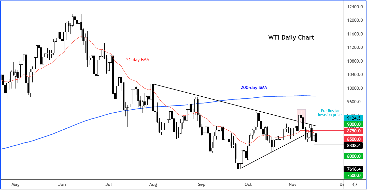 中国市场方面,如果实施新的新冠限制措施将挫伤市场需求,油价未来几周可能进一步下跌。WTI面临跌至80美元的风险,特别是目前价格已跌破三角形态向下延伸: