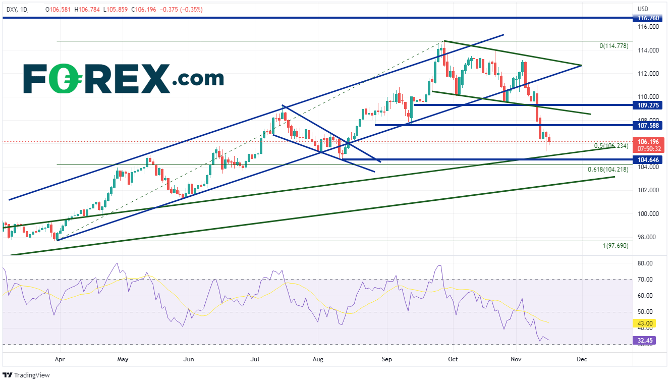 总的来说,美元并没有特别受益于超出预期的零售销售数据。持续遭受抛压的美元指数当天小幅下跌至3月31日低点到9月28日高点区间的50%回撤位106.23附近。如果继续走低,支撑位在2021年5月(绿色)的上行倾斜趋势线105.00附近,然后水平支撑位在8月11日以来的低点104.65附近。在此下方,价格可能会跌至上述区间的61.8%斐波那契回撤位104.22。但如果美元指数反弹,阻力位于前低107.59附近。在此上方,价格会受阻于近期形成的短期通道下沿109.02附近,然后是水平阻力位109.27。