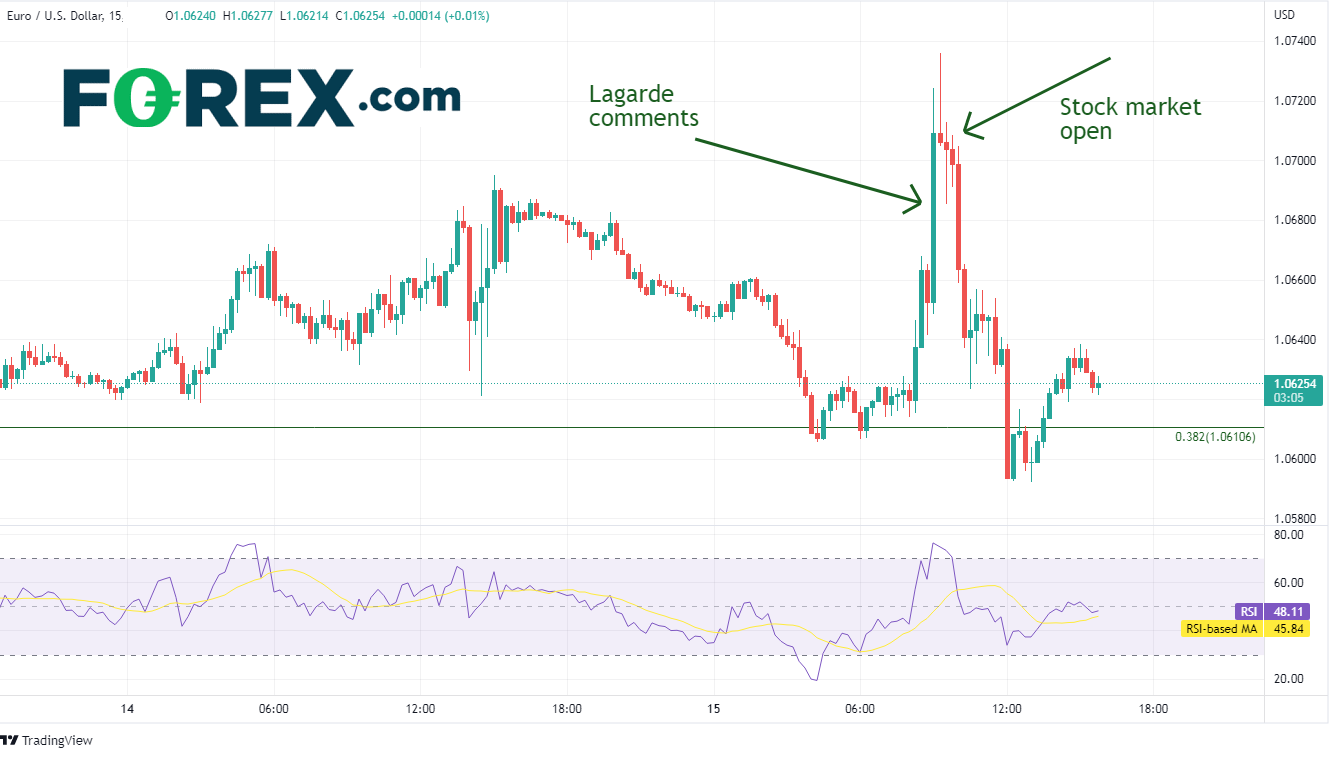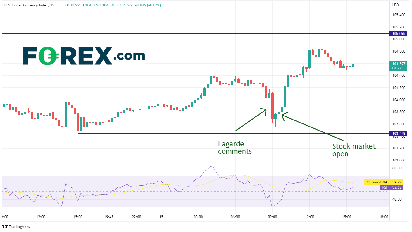 以下是美元指数(DXY)的15分钟图。请注意,当美国股票市场开盘时,美元指数在美国股市开始暴跌后起涨。因克里斯蒂娜·拉加德的鹰派言论走强的欧元/美元走势在一小时内完全反转。