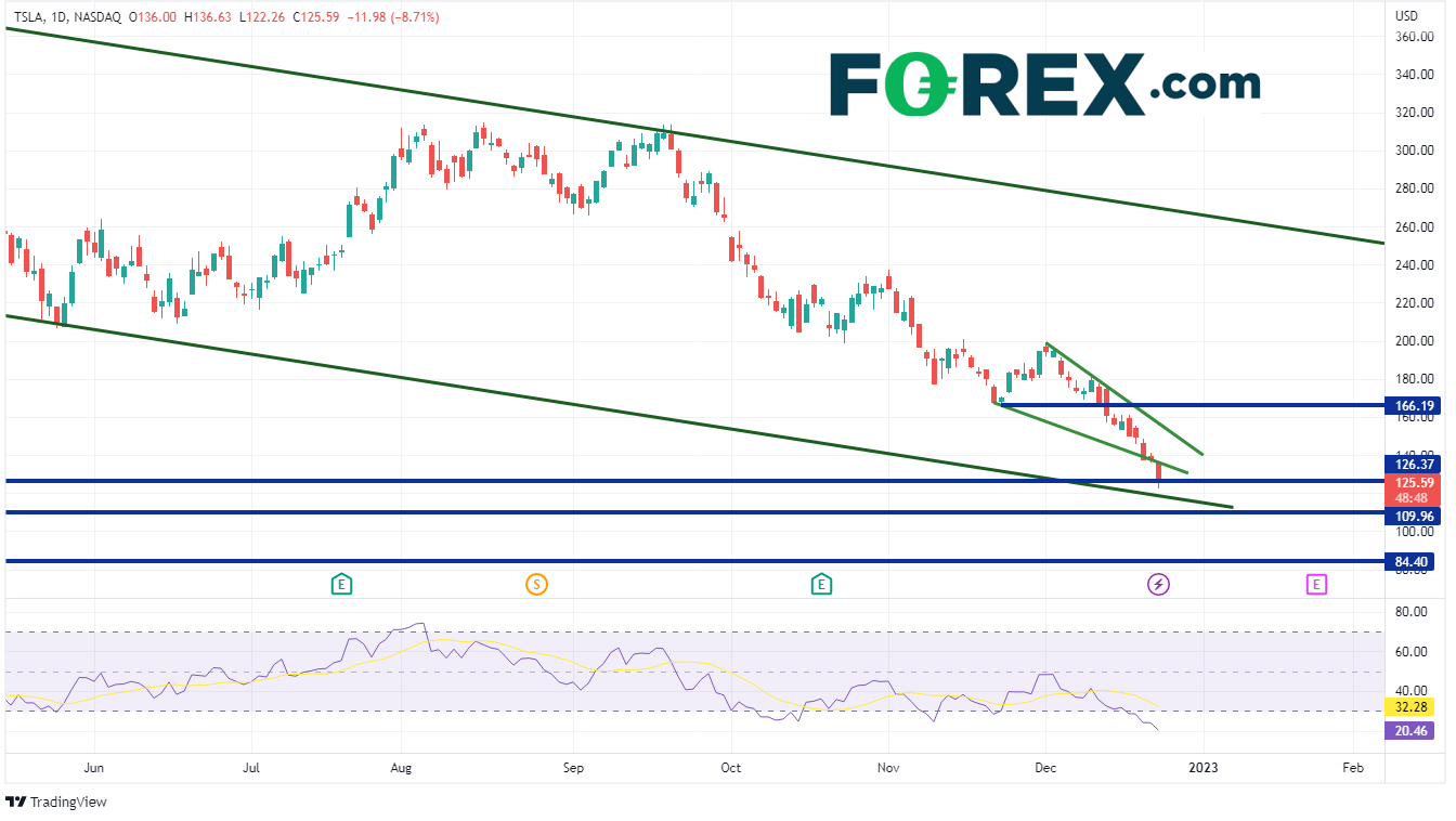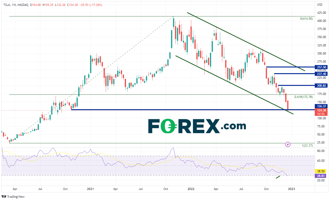 仅在12月,特斯拉股价就从197.08跌至122.26,跌幅超过36%,本月(和本年)还剩6个交易日。特斯拉股价处于20209月以来的最低水平。在周线图上,从上周开始,特斯拉股价大幅跌破20203月大流行低点至202111月历史高点区间的61.8%斐波那契线172.78附近。价格目前正在测试该股自历史高点以来所处的下行通道下沿。