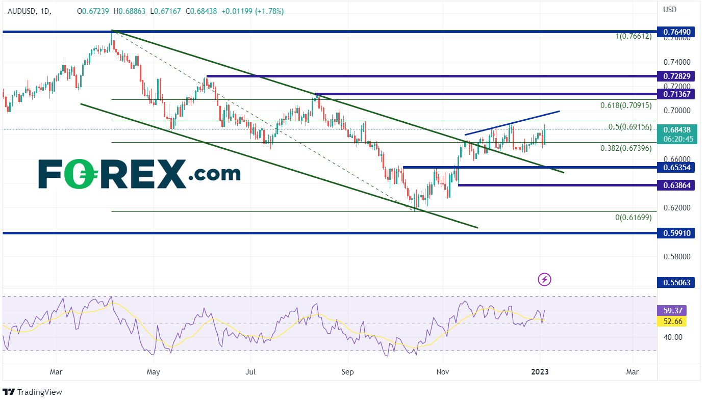 FOMC会议纪要尚未公布,外汇市场颇为平静,但澳元/美元波幅达170点,日内高点0.6886。货币对自202245日创下高点0.7661起,即沿下降通道跌落,后在20221013日下探低点0.6170。自此,澳元/美元节节攀升,在11月中旬突破通道上轨,随后货币对收复2022年高点至2022年低点50%回档位,年终报收于0.6815附近。