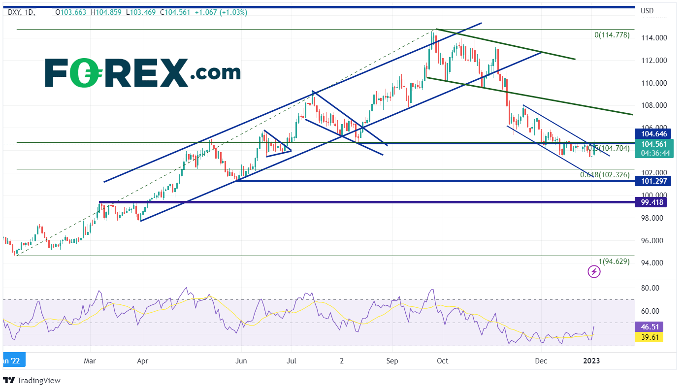 美元指数今年开局良好,上涨1%104.50附近。DXY2022年的大部分时间里上涨,从114日的94.63涨至928日的114.78!然而,在第4季度,该指数回落至略高于涨幅50%的点位,全年收于103.491110日,CPI数据远弱于预期。因此,DXY110.30下跌至11月底的106.28。自此,该指数形成了下行通道,直到年底。今天,在2023年的第一个交易日,DXY突破了通道的下行趋势线,并回到了前面提到的50%回撤位104.70上方。美元是否会在2023年继续走高?