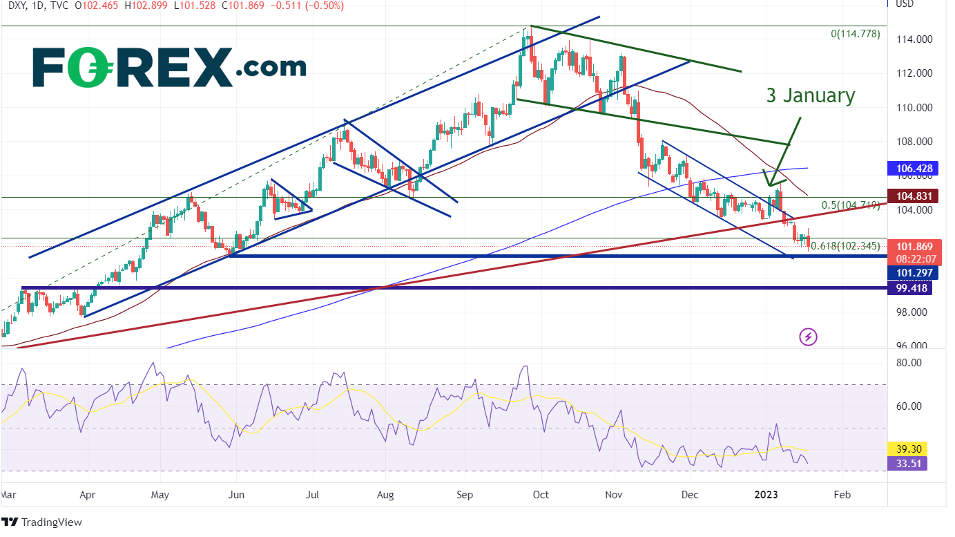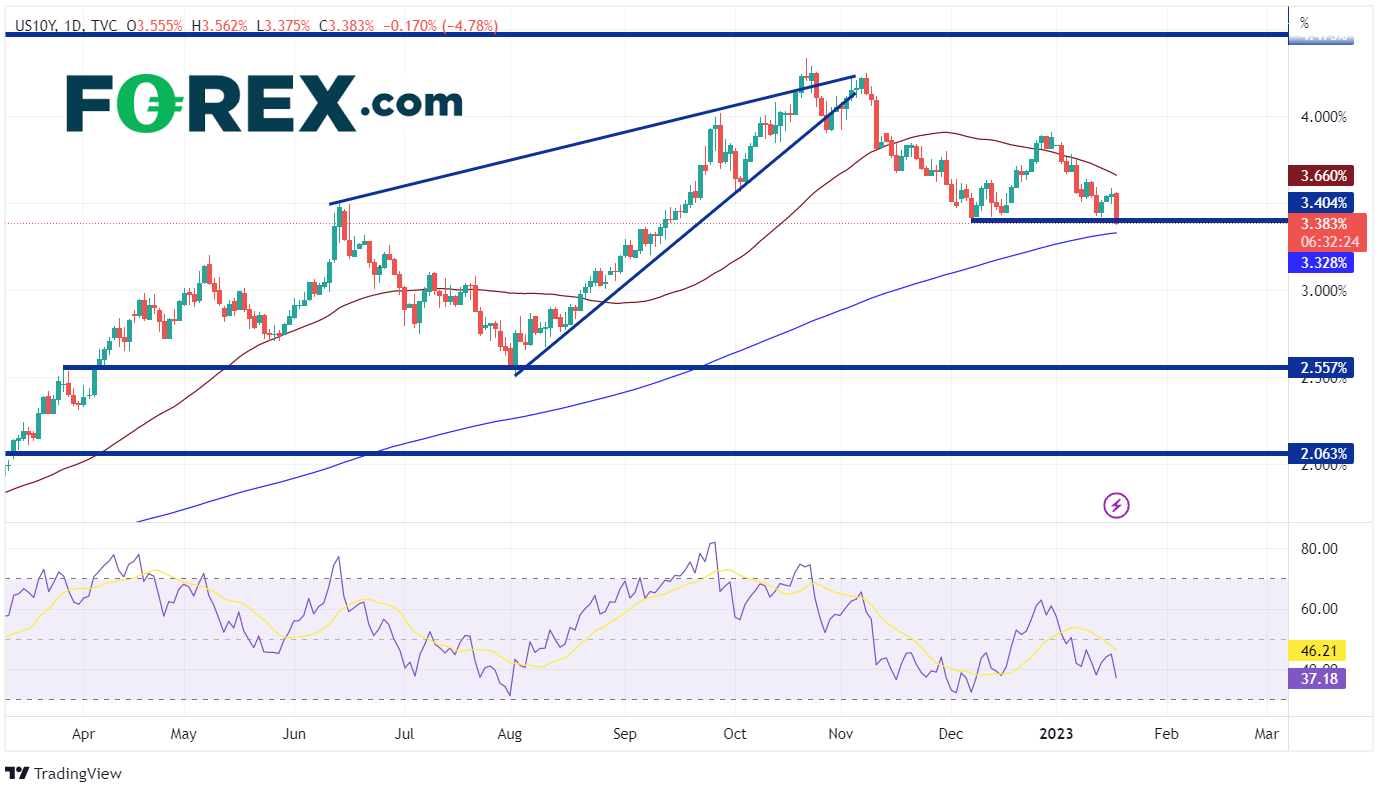 疲软的零售销售、通胀和制造业数据表明,美联储在21日的会议上将更加鸽派。这正在推动利率和美元走低。美国10年期国债收益率跌至20229月中旬以来的最低水平3.375%,而DXY收于2022530日的支撑位101.30