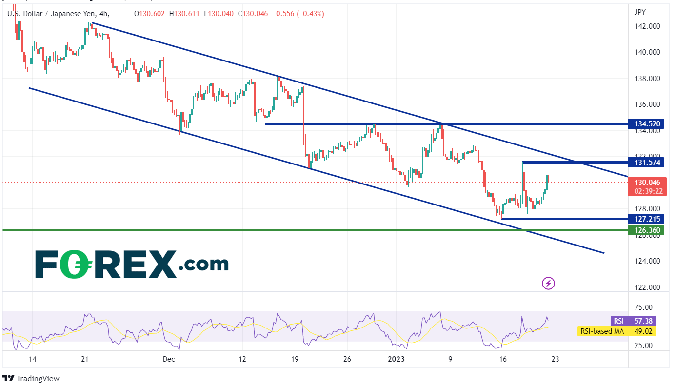在较短的240分钟图上,美元/日元已经形成通道。虽然汇率在日线图上突破了通道,但它仍然在240分钟图上保持在通道内。第一阻力位于1月17日高点131.57。在此之上,价格可能会触及短期通道的顶部趋势线132.18,然后是1月6日以来的高点134.77。但是,如果空头决定在近期高点附近再次出手,美元/日元可能会走低。第一支撑位于1月15日的低点127.22。在此之下,支撑位于2022年5月24日低点126.36,然后是短期通道的底部趋势线125.75。