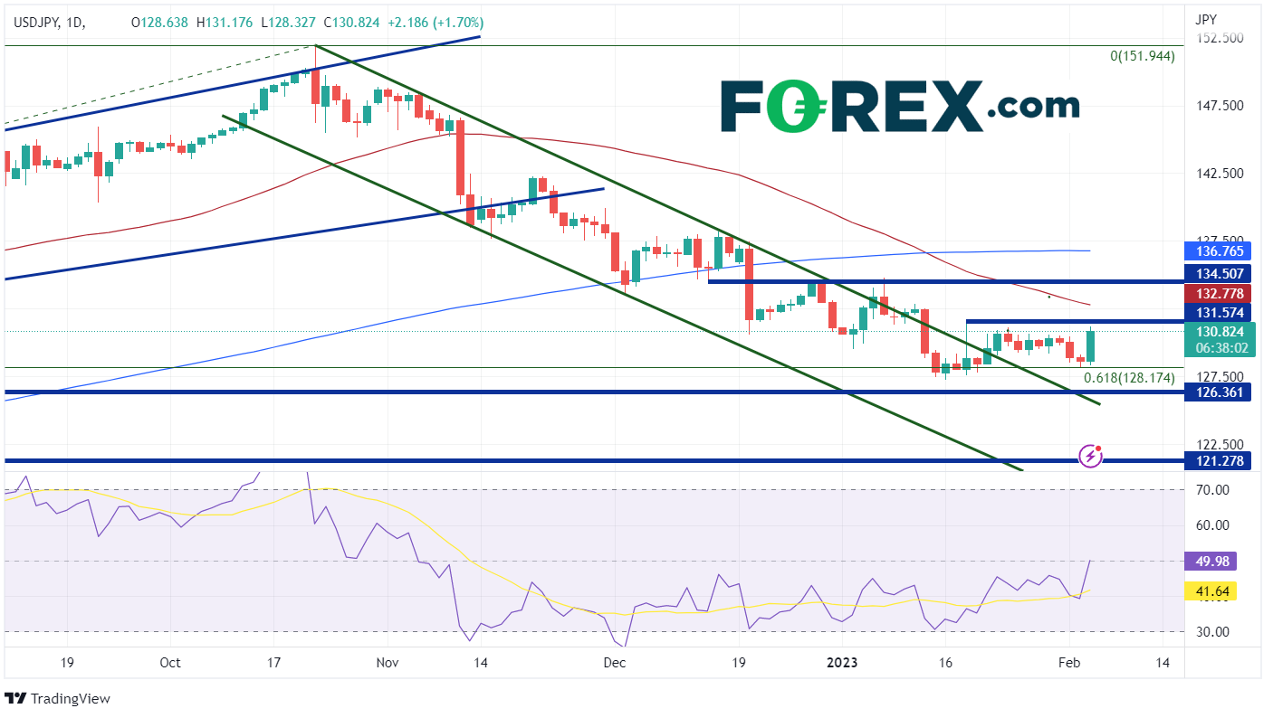 在日线图上,美元/日元自202210月创下20年高点151.95以来,一直在通道稳步走低。最近,该货币对停在了从2022年低点到2022年高点区间的61.8%斐波那契回撤位128.17附近。自118日以来,美元/日元交投于通道外的127.22131.57的横向区间。尽管该货币对今天大幅波动,但仍位于该区间内。