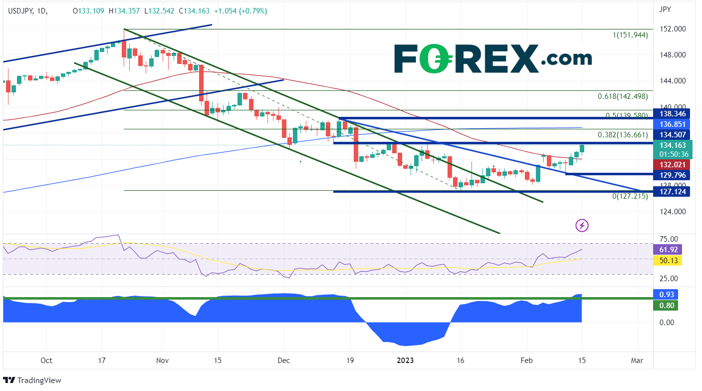 自2022年12月中旬以来,美元/日元也一直交投于127.22和134.50之间。该货币对最近涨破了通道阻力位,即追溯到2022年12月15日的下行趋势线和50日移动平均线。如果美元/日元升至近期高点134.77(很可能伴随着10年期国债收益率走高),则会遇到由2022年10月21日高点到1月16日低点区间的38.2%斐波那契回撤位136.66和200日移动平均线136.85形成的复合阻力位。上方是水平阻力位138.35,然后是上述区间的50%回撤位139.58。然而,如果美国国债收益率走低,可能会拉低美元/日元。第一个支撑位是50日移动平均线132.02。在此之下,该货币对可能会跌至2月10日的低点129.80,然后是下行趋势线129.30附近。