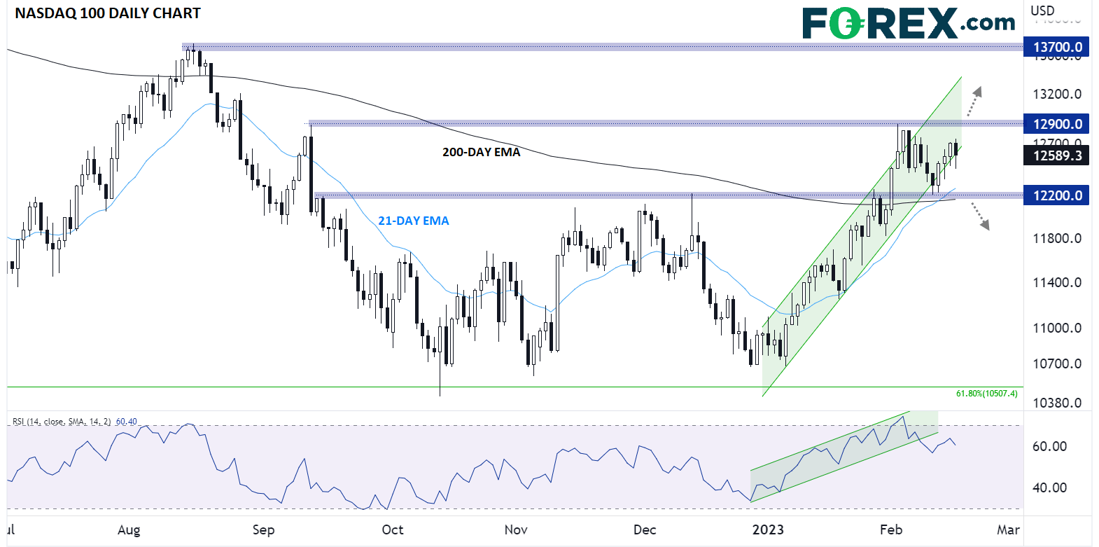 随着“不着陆”情景越来越可信,交易员对股市权重更大的因素存在分歧:利率上升还是经济韧性。本周的交易反映了这一点,纳斯达克100指数跳空低开后反弹,到目前为止每日收涨,因为交易员权衡了高企的价格与最近的经济和财报数据,而这些数据几乎没有显示出经济严重放缓的迹象。