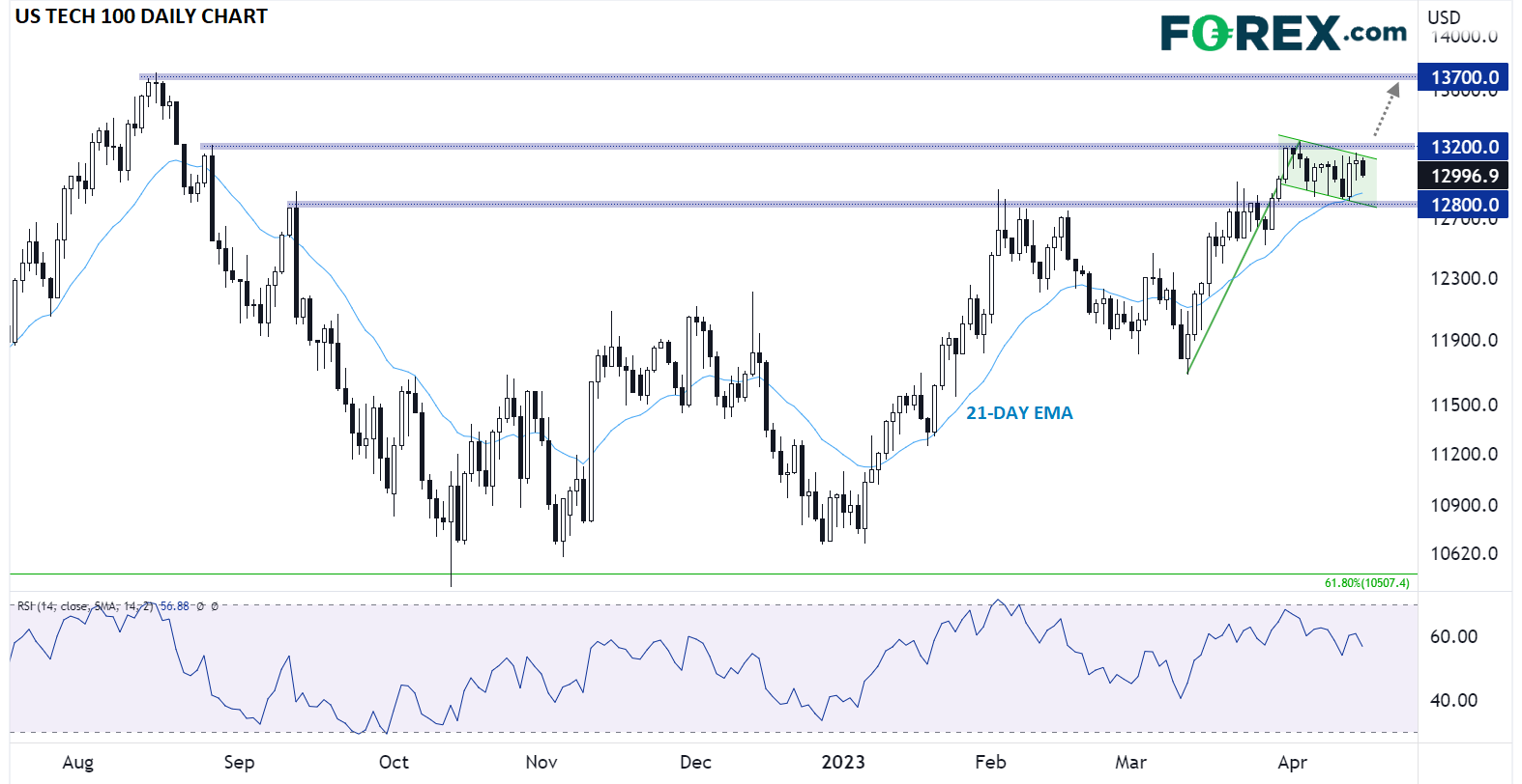 从技术角度来看,以科技股为重的该指数在上月底突破7个月高点后,过去两周内在13,000附近窄幅盘整。从图表上看,3月中旬低点以来的走势看起来像是“看涨旗形”,在强势上涨后进入盘整;随着夏季的到来,如果确认突破13,200上方,该形态意味着延续强劲涨势,向先前的阻力位13,700(也有可能更高)前进。