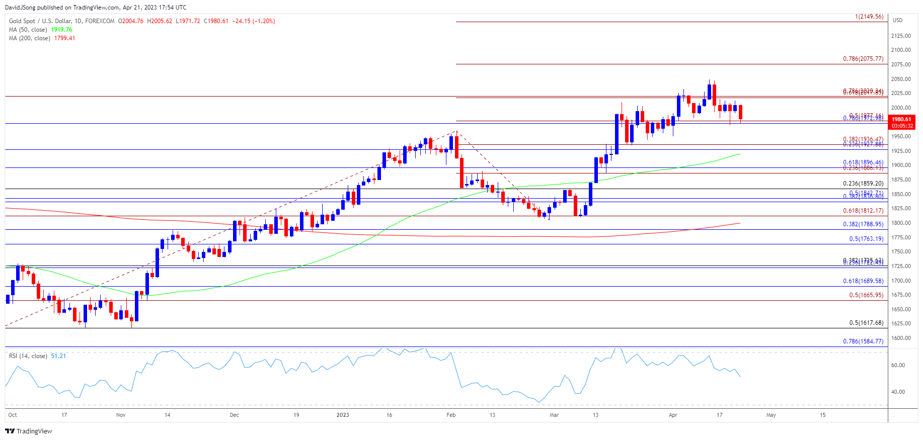 - 由于50日均线(1920美元)呈正斜率,收盘未跌破1973美元(78.6%斐波那契回撤位)至1977美元(50%斐波那契延伸位)区域可能会将金价推回至2018美元(61.8%斐波那契延伸位)至2020美元(78.6%斐波那契延伸位)区域。