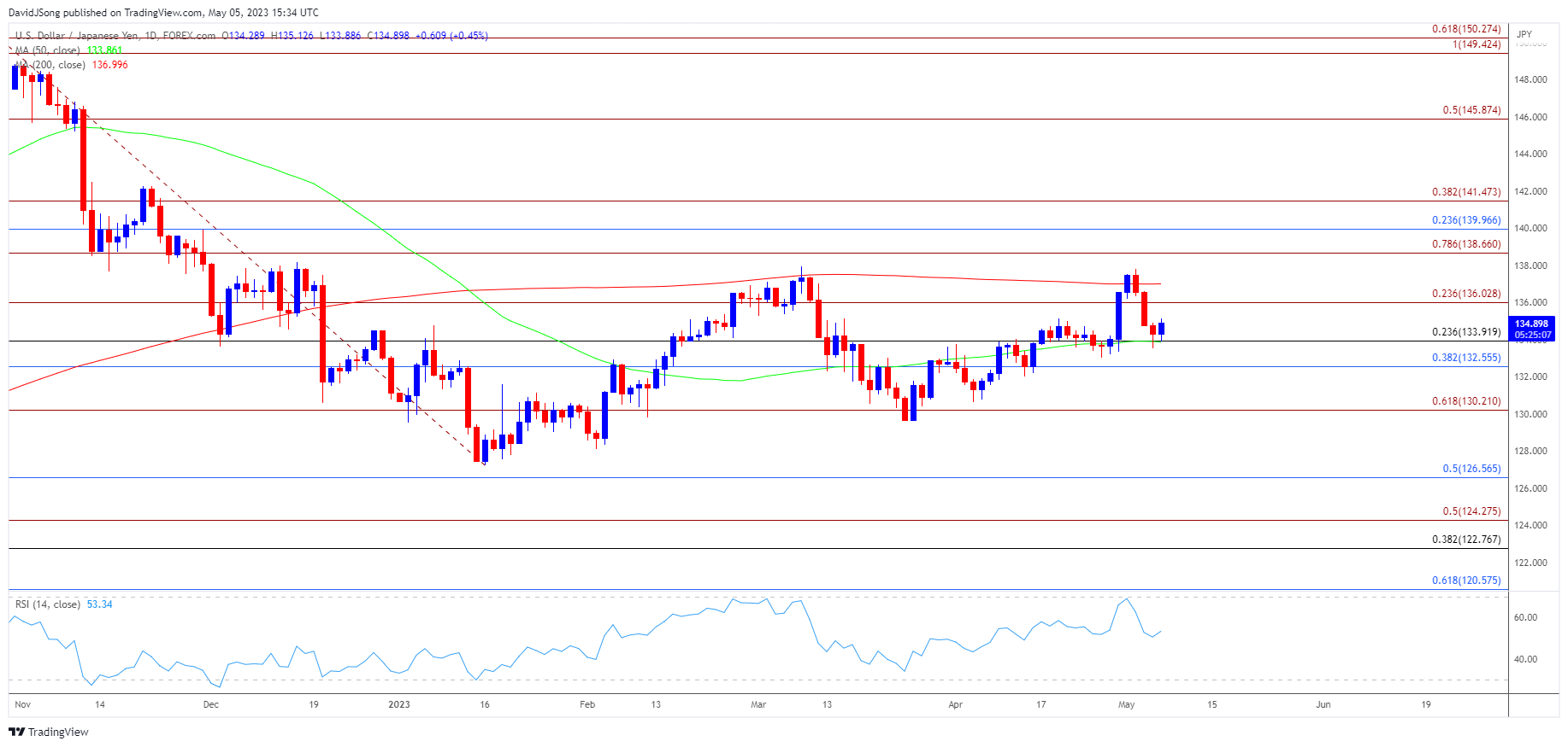 - 不过,美元/日元从50日均线(133.86)反弹,打破了本周早些时候出现的一系列更低的高点和低点。未能突破/收盘低于132.60(38.2%斐波那契回撤位)至133.90(23.6%斐波那契回撤位)区域可能会将汇率推回至136.00(23.6%斐波那契延伸位)并瓦解看跌走势。