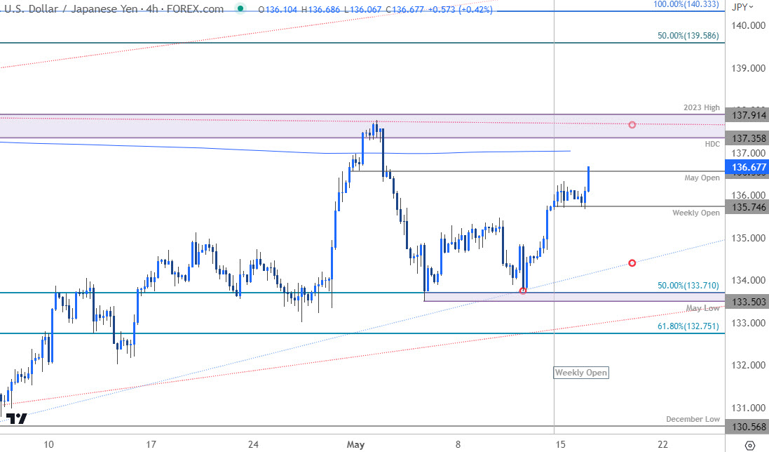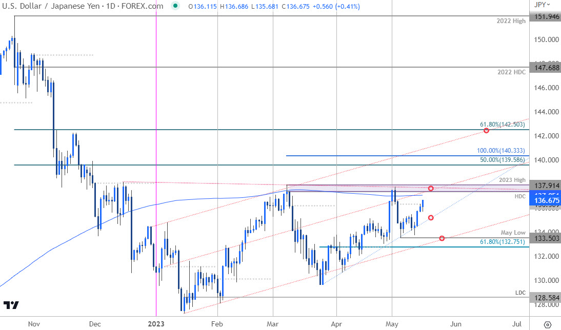 技术展望:在上个月的日元短期展望中,我们注意到美元/日元正在测试135附近的一个关键枢轴区域,“需要突破/收盘高于该关口才能推动下一轮上涨”。美元/日元在4月底走高,但反弹在关键阻力位137.36/90附近步履维艰——该区域由年线高点/日高收盘价构成,与12月高点延伸出来的基本趋势阻力线交汇。